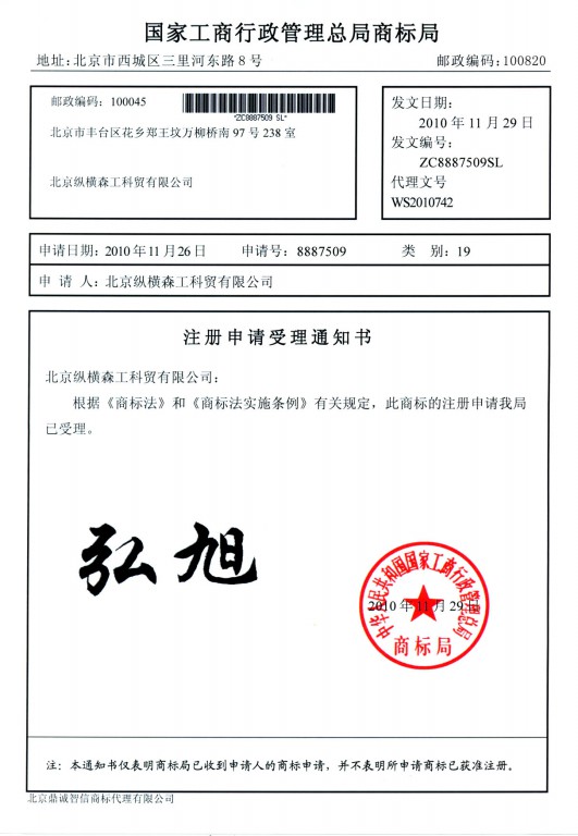 您現(xiàn)在的位置:首頁 ? 弘旭簡(jiǎn)介 ? 資質(zhì)榮譽(yù) ? 商標(biāo)受理通知