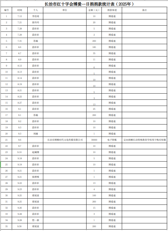 為做好信息公開,打造公開透明的紅十字會,根據《中華人民共和國慈善法》《中華人民共和國紅十字會法》《中國紅十字會章程》的相關規定,現將長治市紅十字會2025年7月1日-2025年9月30日累計捐款接收情況公示如下: