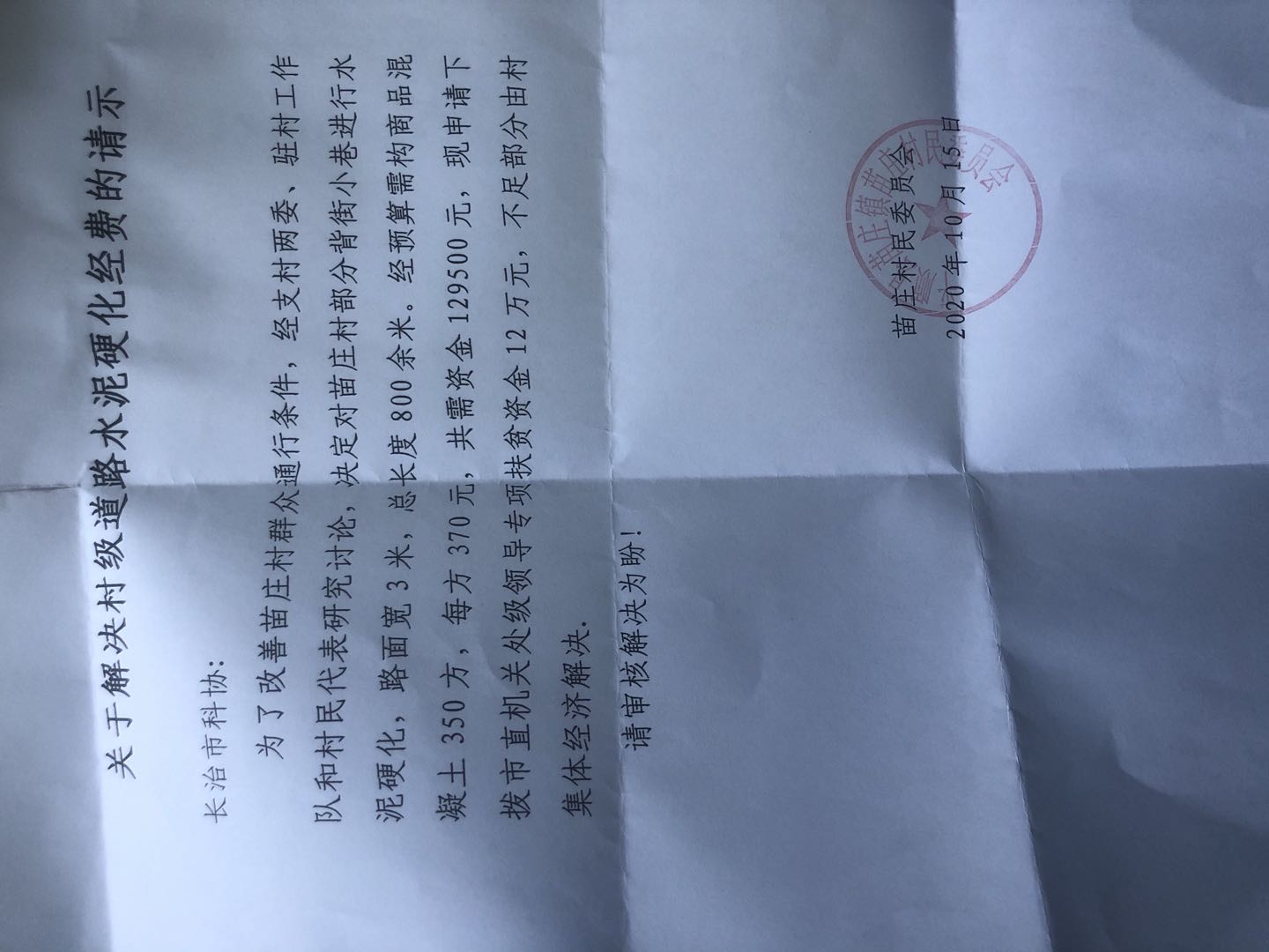 根據《長治市財政局關于下達2020年第一批市級扶貧專項資金的通知》精神,市科協黨組于10月16日對“苗莊村關于解決村級道路水泥硬化經費的請示”進行了研究。經討論,同意你單位使用“長治市科協干部駐村幫扶資金”共計12萬元,用于“村級道路水泥硬化”購置商品混凝土,你單位要合理使用幫扶資金。市科協駐村第一書記、工作隊要對資金的使用進行監管,確保專款專用。