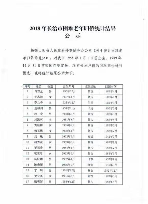 2018年長治市困難老年歸僑統計結果公示