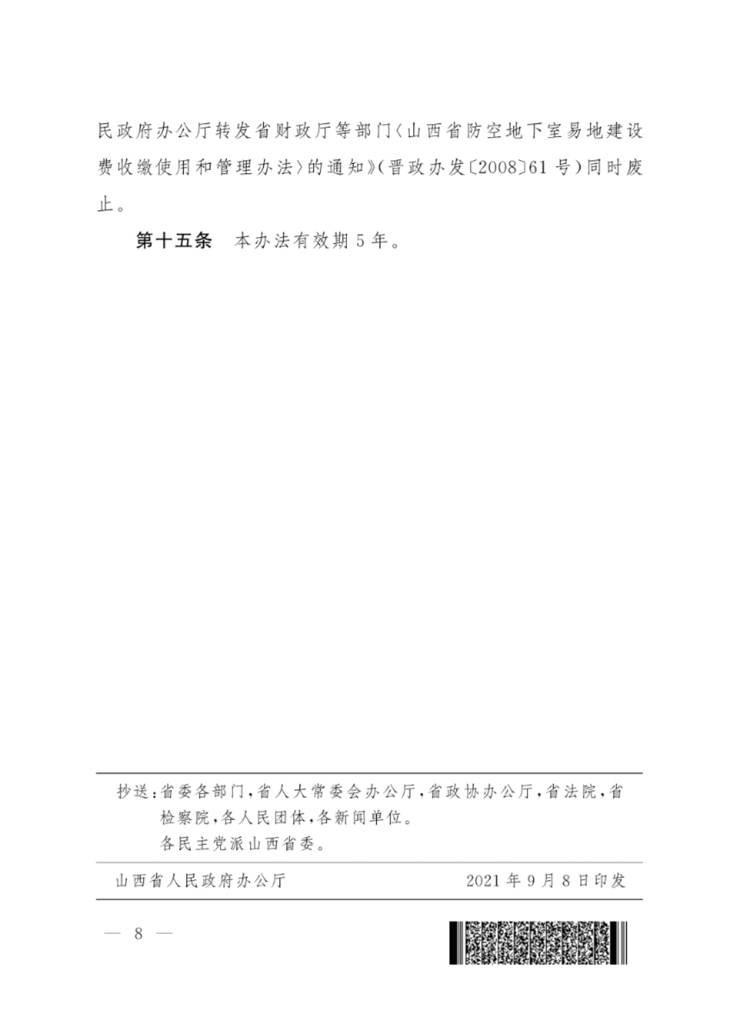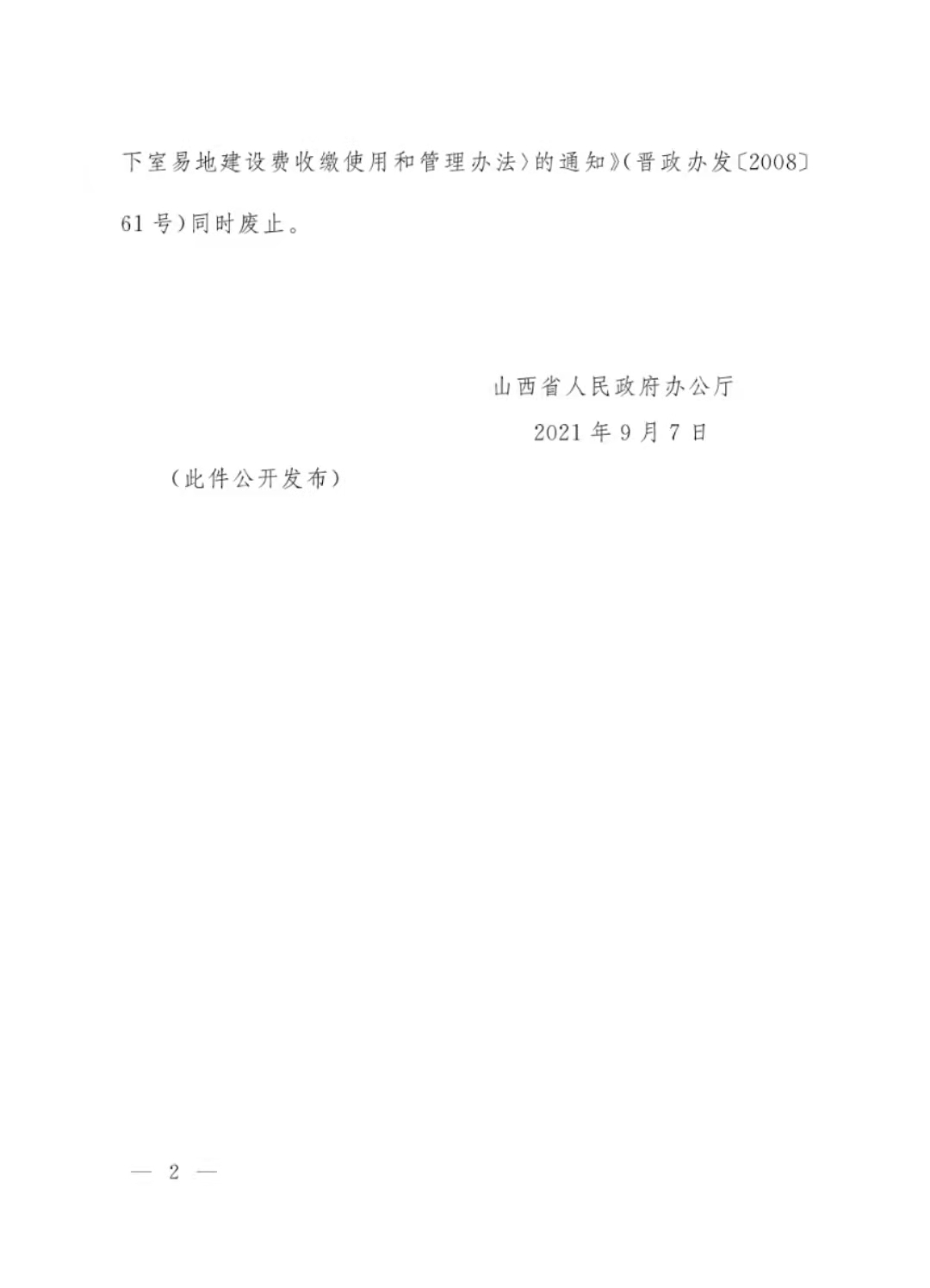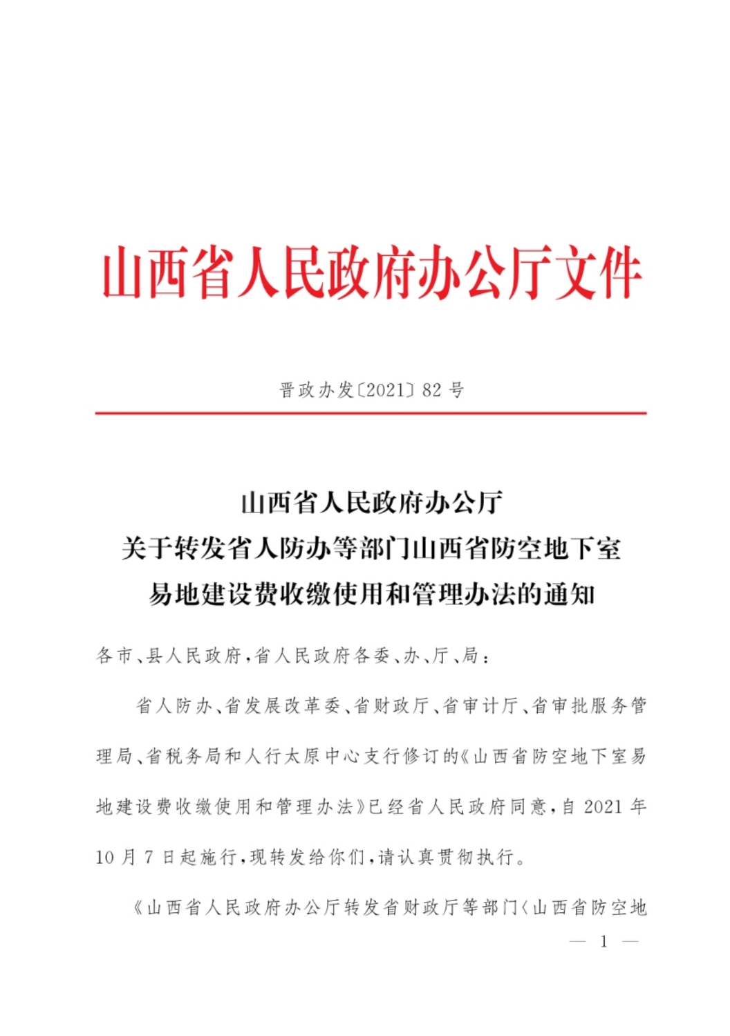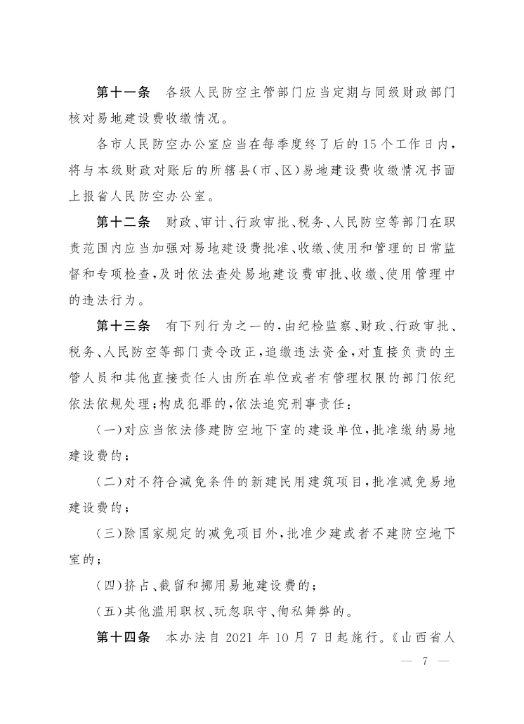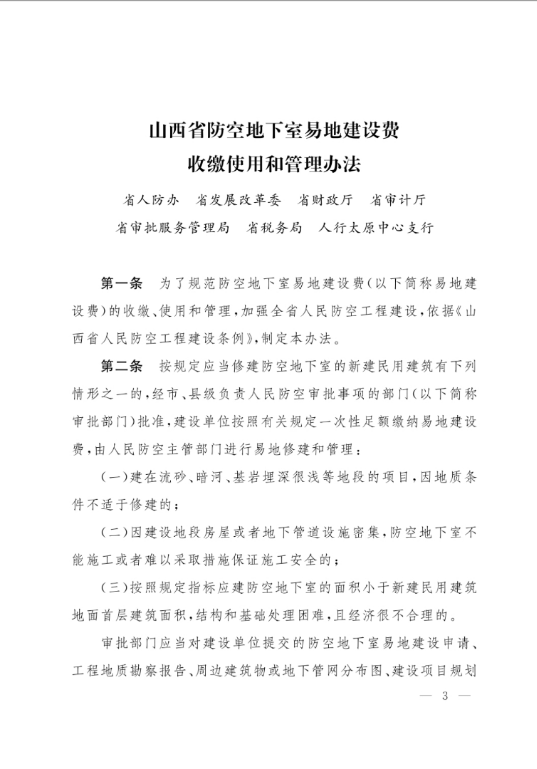 為了規范防空地下室易地建設費的收繳、使用和管理,加強山西省人民防空工程建設,依據《山西省人民防空工程建設條例》,山西省出臺《山西省防空地下室易地建設費收繳使用和管理辦法》,自10月7日起,除四種情形和國家另有規定的減免項目外,各級政府、任何部門和個人不得批準減免易地建設費。