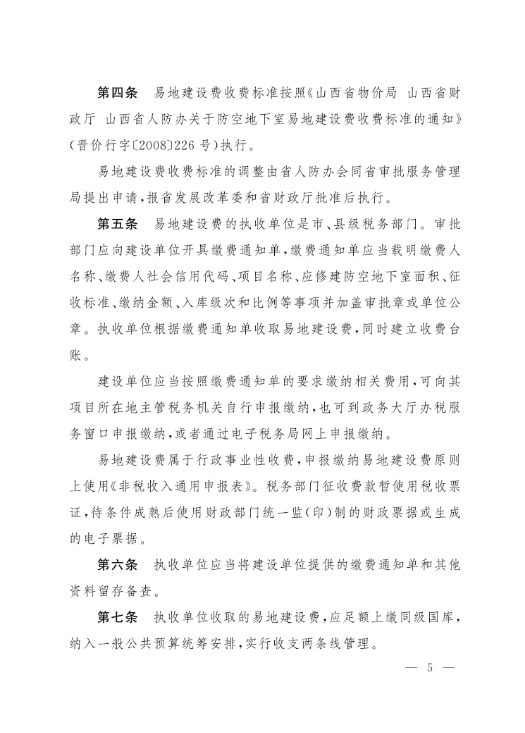 《辦法》規定,易地建設費收費標準按照《山西省物價局山西省財政廳山西省人防辦關于防空地下室易地建設費收費標準的通知》(晉價行字〔2008〕226號)執行。易地建設費收費標準的調整由山西省人防辦會同山西省審批服務管理局提出申請,報山西省發展改革委和省財政廳批準后執行。
