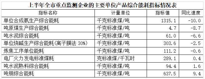 八項主要單位產品工序能耗指標同比“三升五降”。上半年,全市重點監測63戶規上工業企業填報32項單位產品工序能耗指標,指標值同比上升的10個,同比下降的22個。其中,八項主要單位產品綜合能耗指標同比“三升五降”。