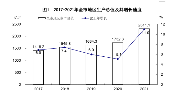 初步核算,全年全市地區(qū)生產(chǎn)總值2311.1億元,比上年增長11.0%。其中,第一產(chǎn)業(yè)增加值93.1億元,增長9.8%,占生產(chǎn)總值的比重為4.0%;第二產(chǎn)業(yè)增加值1382.7億元,增長12.7%,占生產(chǎn)總值的比重為59.8%;第三產(chǎn)業(yè)增加值835.3億元,增長9.0%,占生產(chǎn)總值的比重為36.2%。