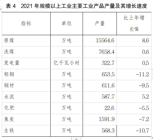 規(guī)模以上工業(yè)企業(yè)原煤產(chǎn)量15564.6萬噸,增長8.6%;發(fā)電量322.7億千瓦時(shí),增長0.5%;焦炭產(chǎn)量1591.9萬噸,下降7.2%;鋼材產(chǎn)量611.6萬噸,下降9.5%。