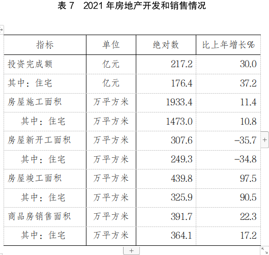 全年房地產(chǎn)開發(fā)投資217.2億元,增長30.0%。其中,住宅投資176.4億元,增長37.2%。
