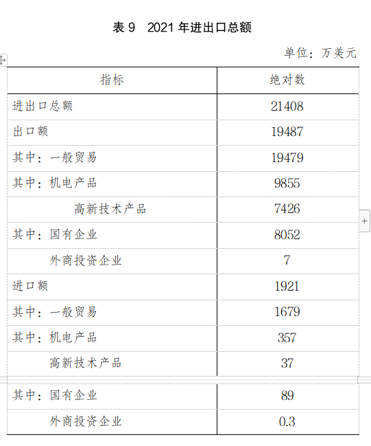 全年全市進(jìn)出口總額21408萬美元。其中,進(jìn)口額1921萬美元;出口額19487萬美元。