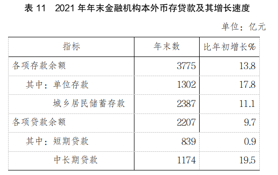 年末全市金融機(jī)構(gòu)本外幣各項(xiàng)存款余額3775億元,比年初增加456億元,比年初增長13.8%。各項(xiàng)貸款余額2207億元,比年初增加194億元,比年初增長9.7%。