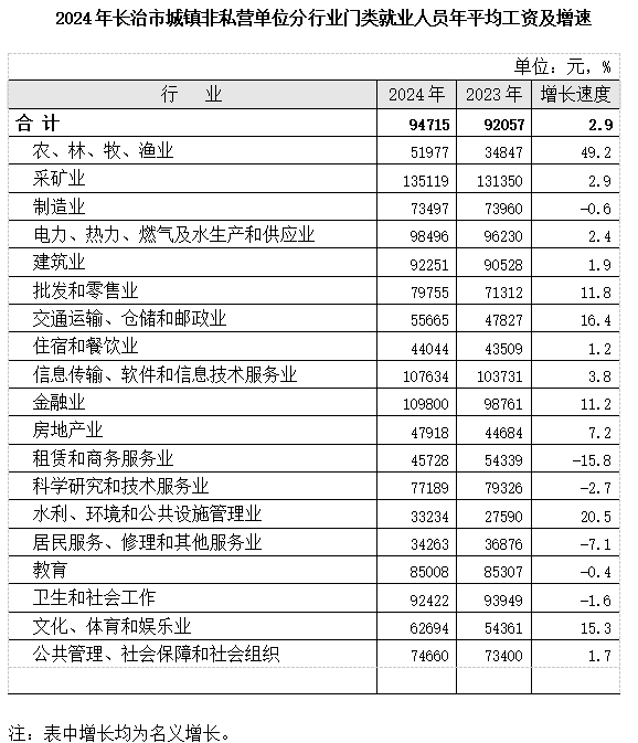 ????2024年長治市城鎮非私營單位就業人員年平均工資為94715元,比上年增加2658元,名義增長2.9%。扣除價格因素,實際增長3.0%。在崗職工年平均工資為96228元。
