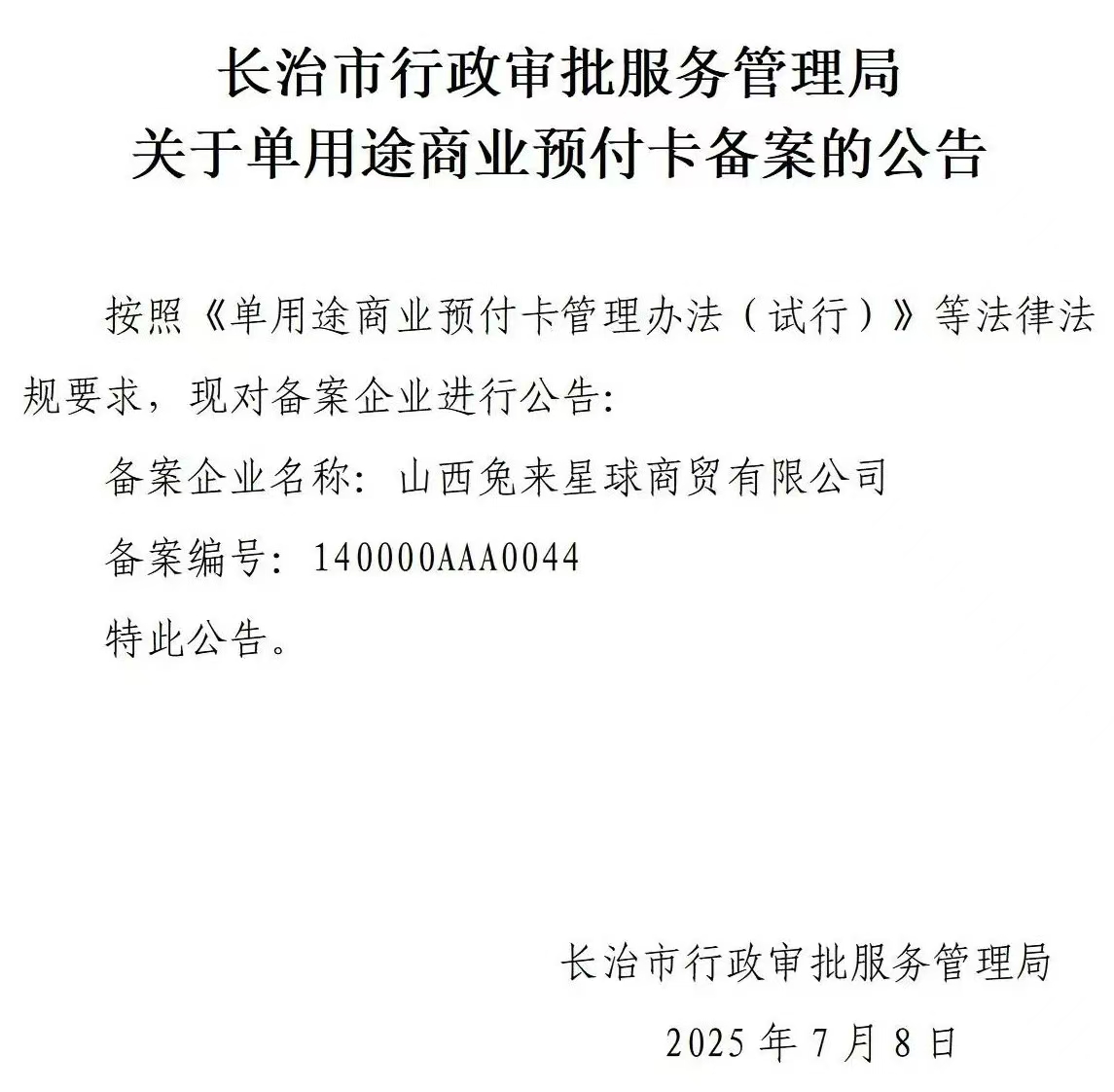 長治市行政審批服務管理局關于單用途商業預付卡備案的公告