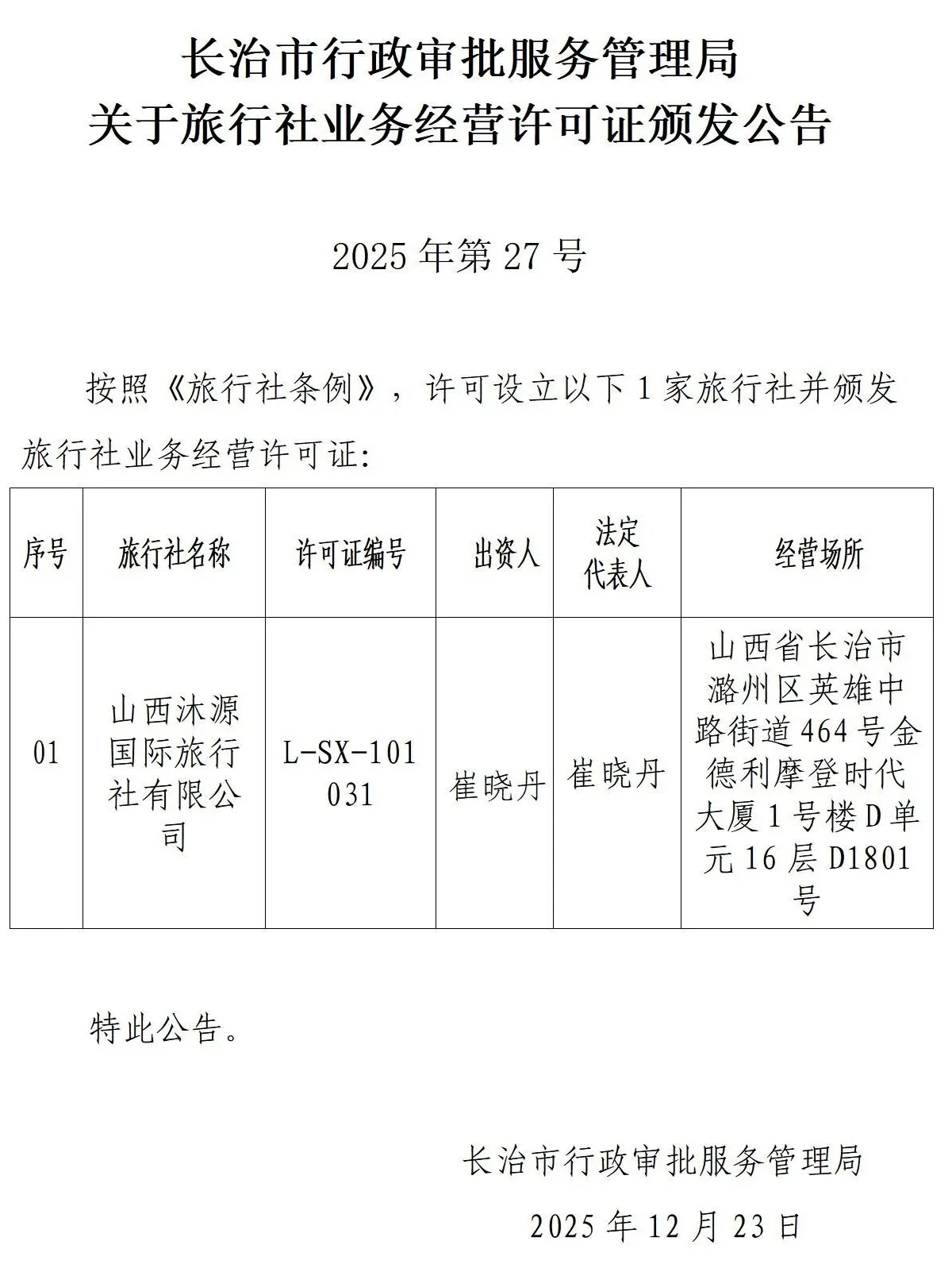 長治市行政審批服務管理局關于旅行社業務經營許可證頒發公告