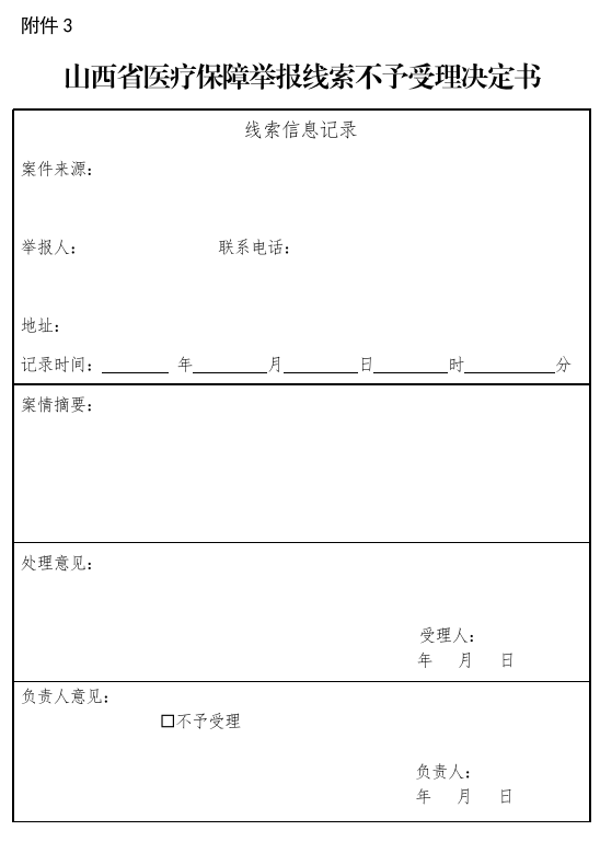 ????(二)舉報人實名舉報的,醫療保障行政部門經核查,舉報線索中的事項不屬于受理范圍的,應當制作《山西省醫療保障舉報線索不予受理決定書》(附件4),并書面告知舉報人。