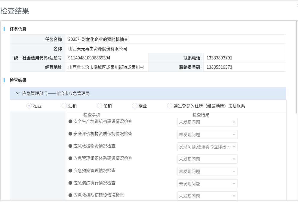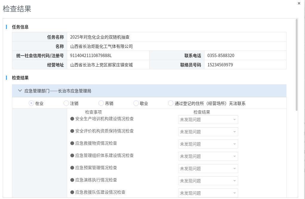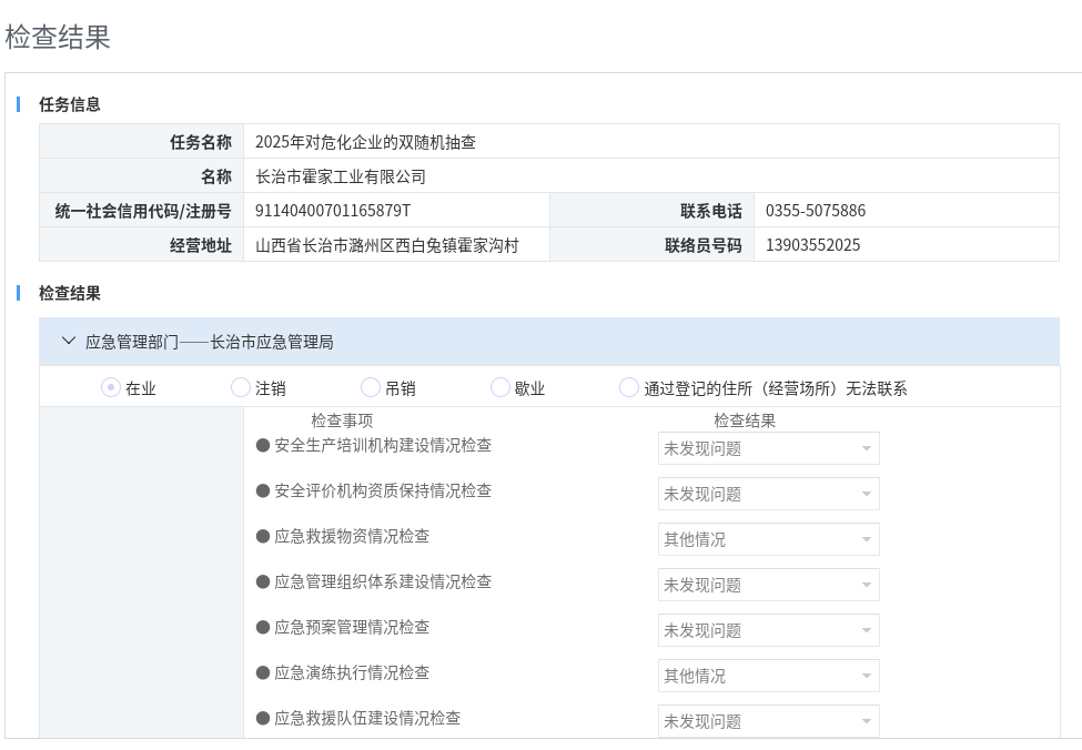 2025年長治市應急管理局“雙隨機、一公開”抽查檢查結果公示(危險化學品))