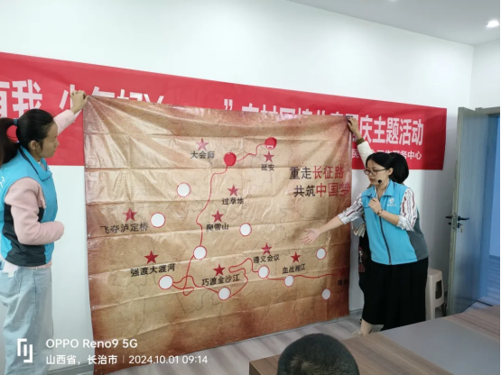 活動前,社工邀請孩子們分享自己了解的關于國慶節(jié)的來源和建國相關的小故事,現(xiàn)場更有小朋友背出毛主席的詩詞《長征》。隨后,社工帶領孩子們認識兩萬五千里長征,講解長征的起始點以及長征中的經(jīng)典事跡,并在游戲中一起感受國家獨立與復興的艱難。