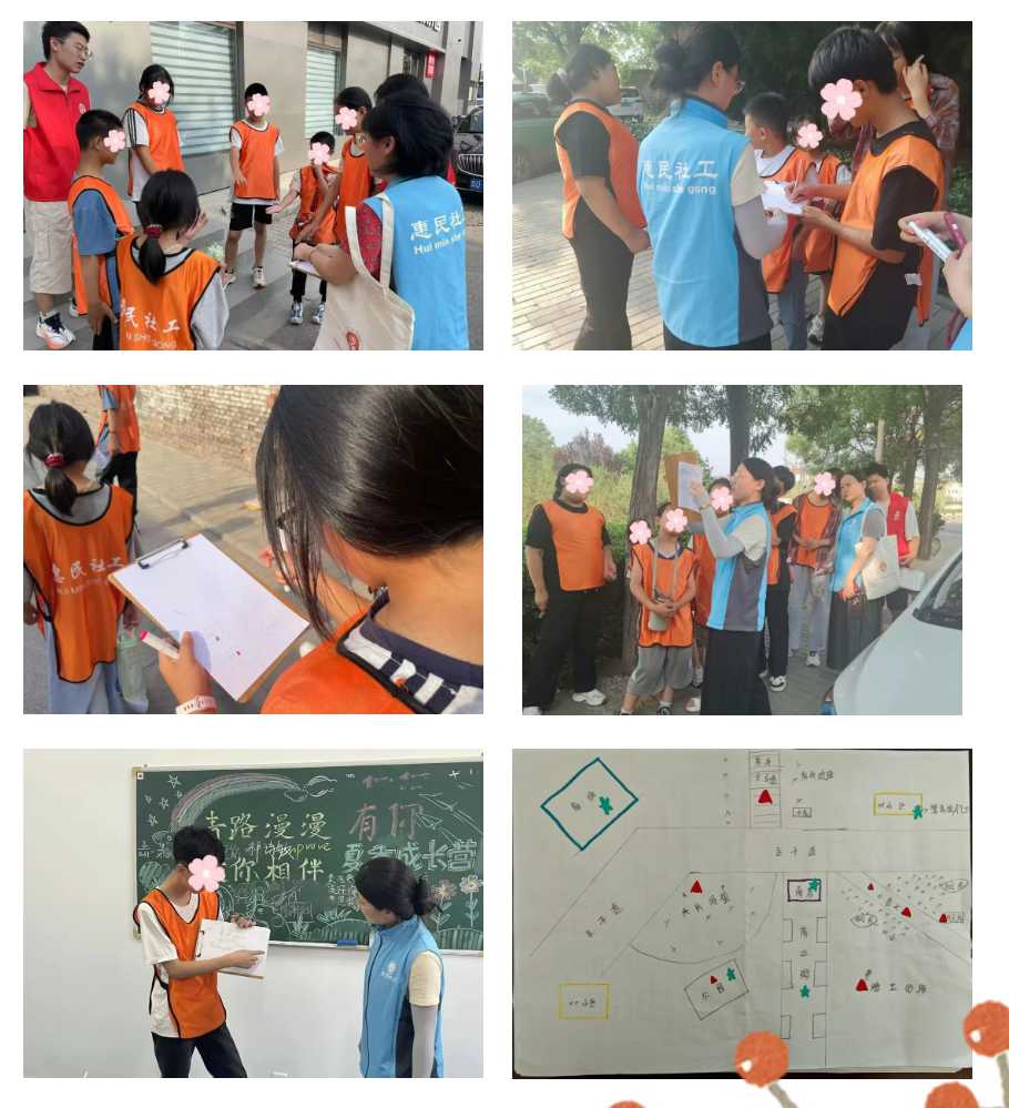 1.實地觀察:“小偵探”們分三路探索,在社工的路線引領下仔細觀察道路環境、店鋪分布、人流特點等。“這個小巷子看著就很不安全,尤其晚上的時候,一定不能獨自在這邊”“這里有個水果超市,如果在路上我被陌生人強制拉扯帶走,我是不是可以向他求助”……“小偵探”們每到一個地方都發表著自己的想法,在不斷的觀察和討論中識別著周邊的潛在風險與求助資源定位。