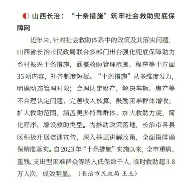 近年來,針對(duì)社會(huì)救助體系中的政策及其落實(shí)問題,市民政局聯(lián)合多部門出臺(tái)強(qiáng)化兜底保障助力鄉(xiāng)村振興十條措施,涵蓋救助管理范圍管理、程序等十方面35項(xiàng)內(nèi)容,補(bǔ)齊制度短板。“十條推施”從多維度發(fā)力,明確動(dòng)態(tài)管理時(shí)限;合理認(rèn)定財(cái)產(chǎn),解決車輛、房產(chǎn)等不合理認(rèn)定問題,完善收入核算,鼓勵(lì)困難群體增收,擴(kuò)大教助范圍,涵蓋更多特殊群俗;加大救助力度,簡(jiǎn)化程序、增設(shè)救助類型。為推村政策落地,長(zhǎng)治市各縣區(qū)積極開展培訓(xùn)宣傳,深入基層講解政策,全面摸排確保精準(zhǔn)落實(shí)。自2023年“十條措施”實(shí)施以來,全市重病、重殘、支出型困難群眾等納入低保數(shù)千人,臨時(shí)救助超3.8萬人次,成效明顯。