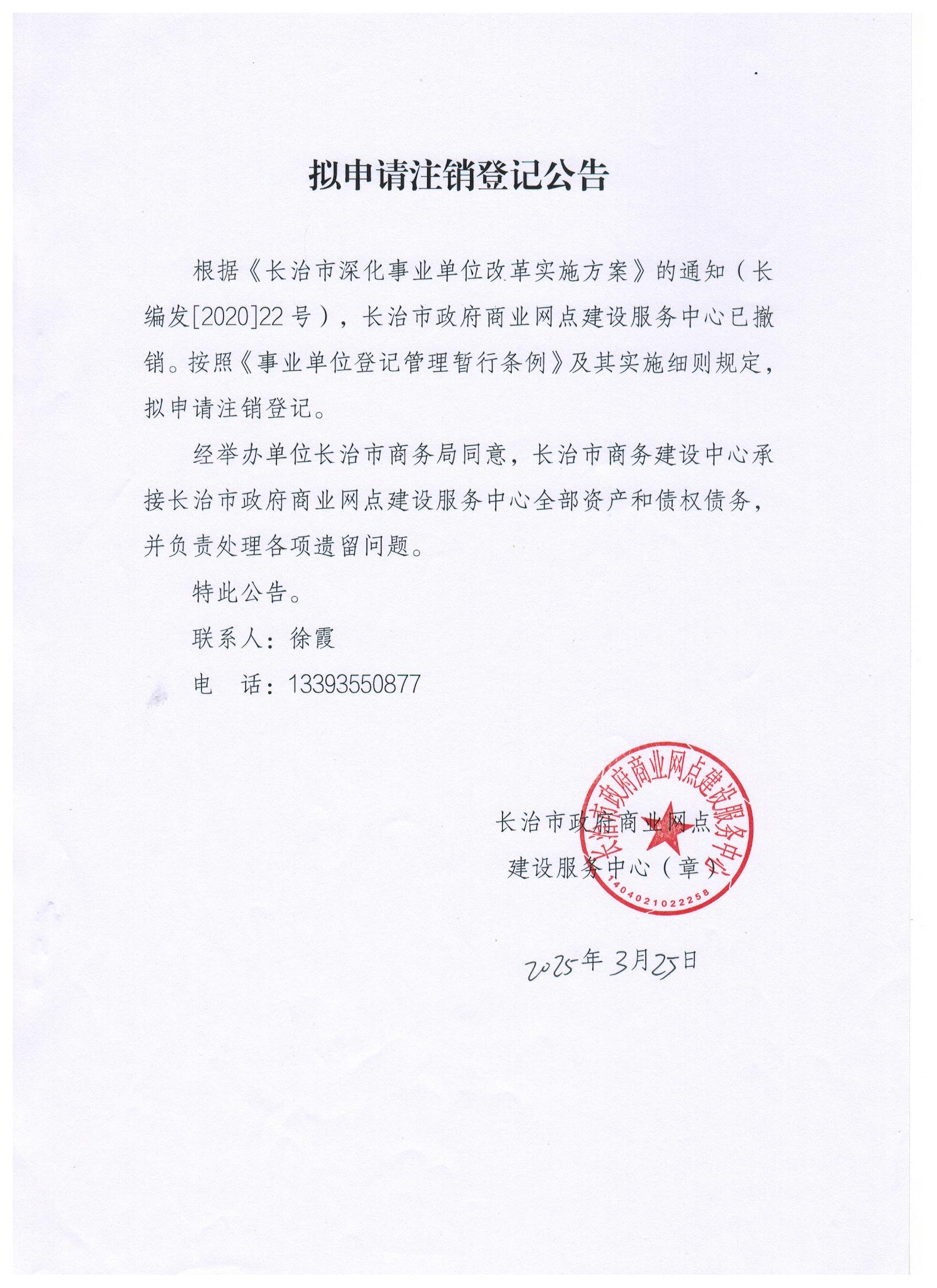 現(xiàn)有長治市政府商業(yè)網點建設服務中心、長治市衛(wèi)生局衛(wèi)生監(jiān)督所2家事業(yè)單位法人申請注銷登記,現(xiàn)發(fā)布其擬申請注銷登記公告。
