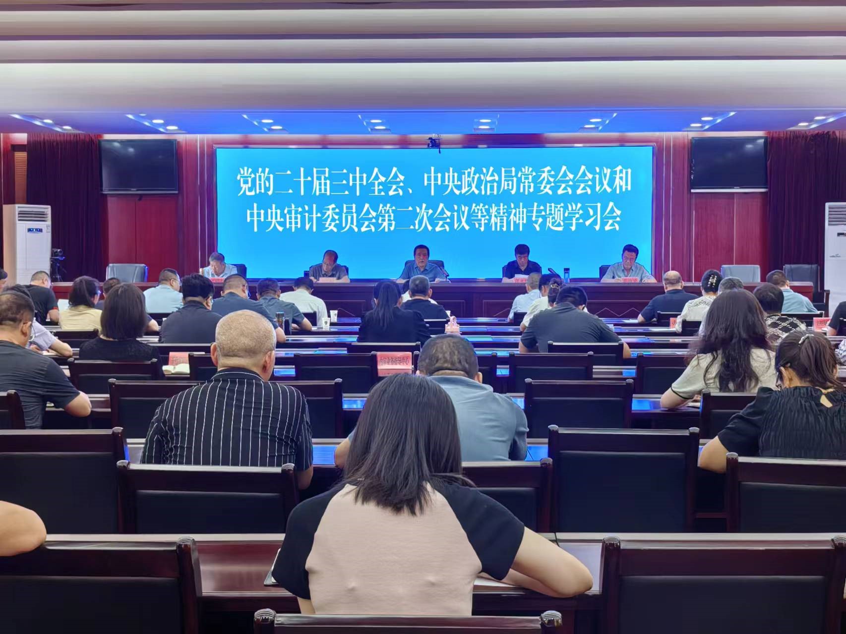 ????7月23日,長(zhǎng)治市審計(jì)局集中專題學(xué)習(xí)黨的二十屆三中全會(huì)、中央政治局常委會(huì)會(huì)議、二十屆中央審計(jì)委員會(huì)第二次會(huì)議和審計(jì)署、審計(jì)廳專題學(xué)習(xí)會(huì)議精神。局黨組書記、局長(zhǎng)賈文革主持會(huì)議,局機(jī)關(guān)、事業(yè)單位全體人員和各縣區(qū)審計(jì)局主要負(fù)責(zé)同志參加會(huì)議。
