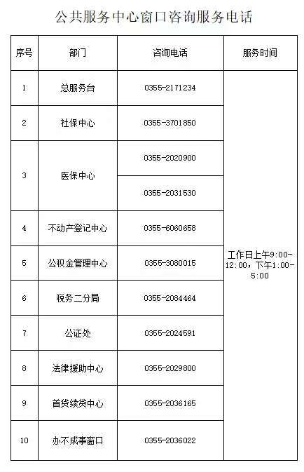 ? ?? ? ?為持續(xù)優(yōu)化政務(wù)服務(wù)環(huán)境,方便廣大市民咨詢業(yè)務(wù),現(xiàn)將市公共服務(wù)中心各窗口咨詢服務(wù)電話更新如下: